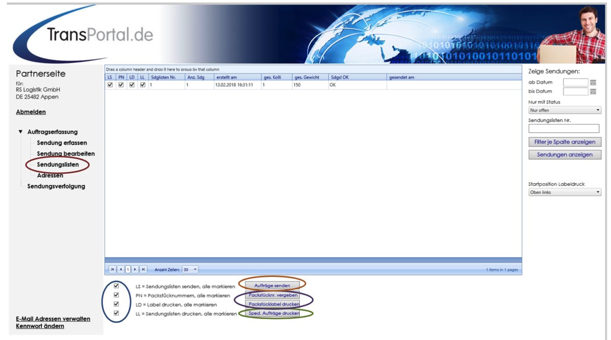 Sendungslisten Nummer (Bsp. Datum TTMMJJ) ins Kästchen eintragen